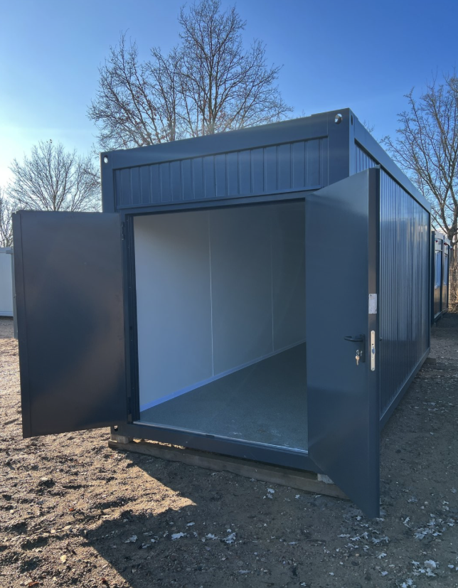 Dieser großzügige Materialcontainer bietet eine sichere und wetterfeste Lagerlösung für Werkzeuge, Waren oder Maschinen. Dank der voll öffnenden Doppelflügeltür ist eine barrierefreie Beladung auch bei sperrigen Gütern jederzeit gewährleistet.